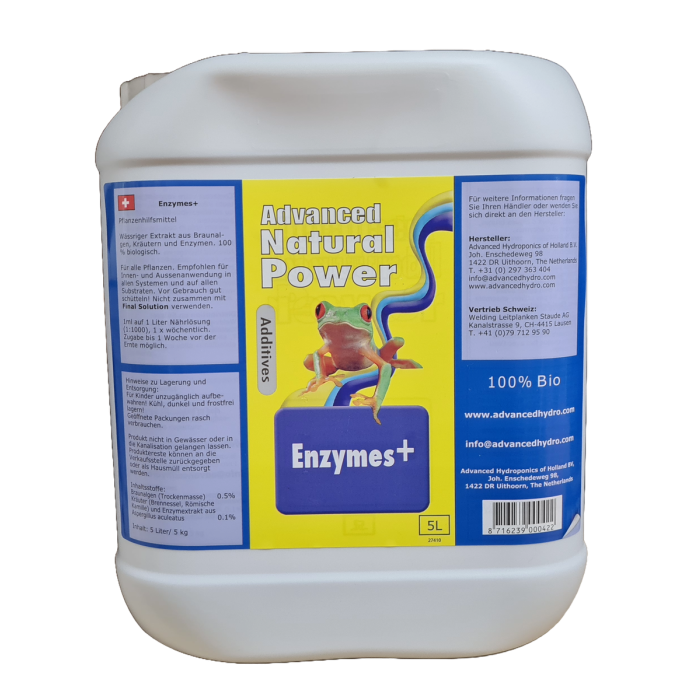 Eine natürliche "Enzyme"-Komponente der Natural Power-Linie aktiviert die begünstigten Mikroorganismen in den Kultursubstraten, was dazu beiträgt, sesshafte Salze zu entfernen und tote Wurzeln abzubauen. Dies verbessert die Fähigkeit der Pflanzen, die Nährstoffe aufzunehmen, und ermöglicht eine gesunde Entwicklung. Die "Enzyme" sind während des grössten Teils der Wachstumszeit der Bewässerung beizufügen und werden von der Mehrheit der erfolgreichen Züchter verwendet.