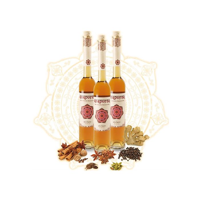 So, wie die einzelnen Klangfarben der Instrumente eines Orchesters und deren Melodik zu einem harmonischen, kraftvollen und emotional ausdrucksstarken Musikerlebnis verschmelzen, so besteht das unvergleichlich breite Geschmacksspektrum von Anapurna erstens aus einer ganzen Palette von synergistisch ineinandergreifenden, sich ergänzenden Aromen, und zweitens den rezeptiven Qualitäten wie besonders hochfrequente Süsse (Fructose/Fruchtzucker), beissende Schärfe (Ingwer, Pfeffer), dem unterschwelligen Bitter von Kardamom und Vanillin und dem wärmenden Eindruck vom Alkohol. (Akohol 30% vol)