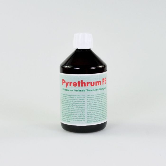 Pyrethrum FS ist ein breit und schnell wirksames Insektizid, welches aus den getrockneten Blüten von Chrysanthemen-Arten (Tanacetum cinerariifolium) gewonnen wird. Als Leitsubstanz gilt Pyrethrin. Wie bei Pflanzenextrakten üblich, sind aber auch andere Wirksubstanzen enthalten. Als Synergist (Erhöhung der Wirksamkeit) ist Sesamöl enthalten. Die Wirkstoffe werden durch Sonnenlicht schnell abgebaut und sind nur während kurzer Zeit wirksam. Pyrethrum FS ist nicht nützlingsschonend.