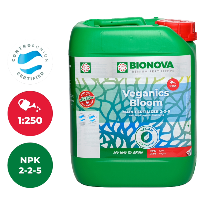 Veganics Grow & Bloom sind 100% organische pflanzliche Flüssignährstoffe. Veganics Bloom ist eine einzigartige Mischung aus rein pflanzlichen Rohstoffen und organischen Mineralien, die keine tierischen Abfälle enthält und sehr wenig Ballastsalze enthält. Dieser vegane Nährstoff ist ein vollständiges NPK-Düngemittel und speziell für den organischen Gartenbau formuliert. Veganics Bloom enthält alle notwendigen Zutaten für eine reiche Blüte. Dies führt zu einem gesunden und effektiven Bodenleben. Früchte und Blumen von besserer Qualität und besserem Geschmack! Veganics Bloom muss zusammen mit Veganics Grow verwendet werden.