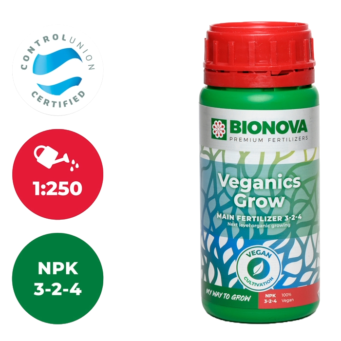 Veganics Grow & Bloom sind 100% organische pflanzliche Flüssignährstoffe. Veganics Grow ist eine einzigartige Mischung aus rein pflanzlichen Rohstoffen und Meeresmineralien, die keine tierischen Abfälle enthält und sehr arm an Ballastsalzen ist. Dieser vegane Nährstoff ist ein vollständiges NPK-Düngemittel und speziell für den organischen Gartenbau formuliert. Veganics Grow enthält alle notwendigen Inhaltsstoffe für ein gesteigertes effizientes Wachstum und macht die Pflanzen widerstandsfähiger gegen Stressfaktoren. Dies führt zu einem gesunden und effektiven Bodenleben. Früchte und Blumen von besserer Qualität und Geschmack! Veganics Grow muss mit Veganics Bloom verwendet werden.