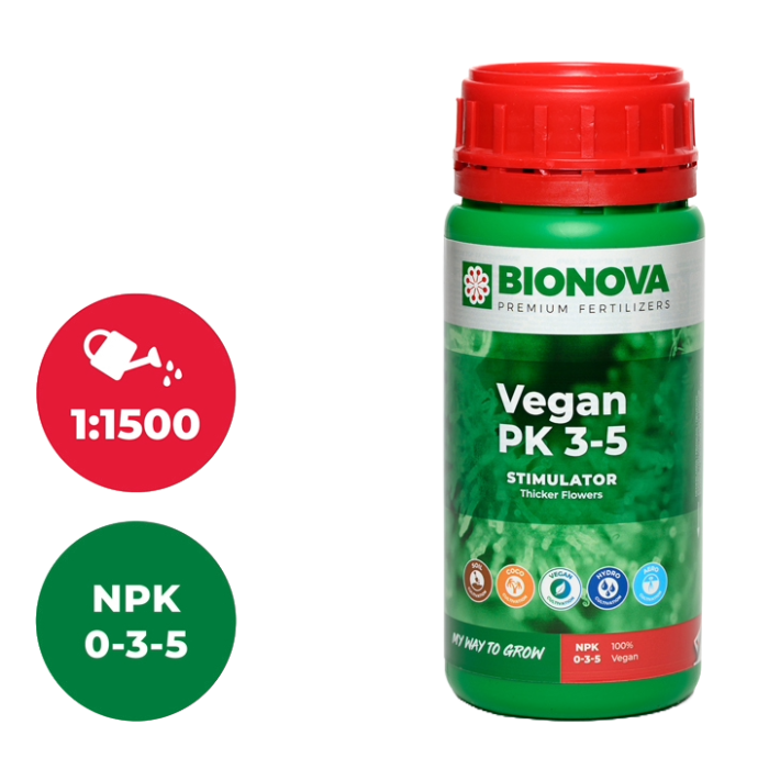 Bionovas Vegan PK 3-5 ist ein 100% veganer Phosphor-Kalium-Booster, der frei von tierischen Inhaltsstoffen ist und nur pflanzliche Materialien enthält! Es ist die perfekte Zusammensetzung als Hauptblühstimulator. Phosphor entwickelt ein gesundes und ausgedehntes Wurzelsystem und eine üppige Blüte. Kalium fördert die Blühwirkung in der Pflanze. Die Kombination dieser beiden Komponenten auf vegane Weise macht es zum ersten veganen Blühverstärker in der Branche.