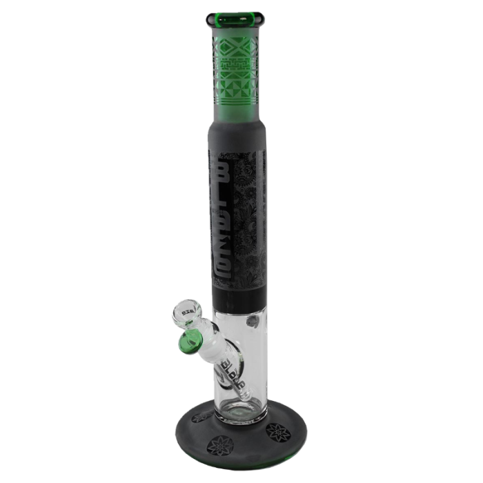 Toll gemusterte und zweifarbig gefärbte Zylinderbong der Marke BLAZE GLASS®. Beeindruckend ist vor allem das aufwendige Glanz-Matt-Finish der gemusterten Stellen und das geprägte Logo.