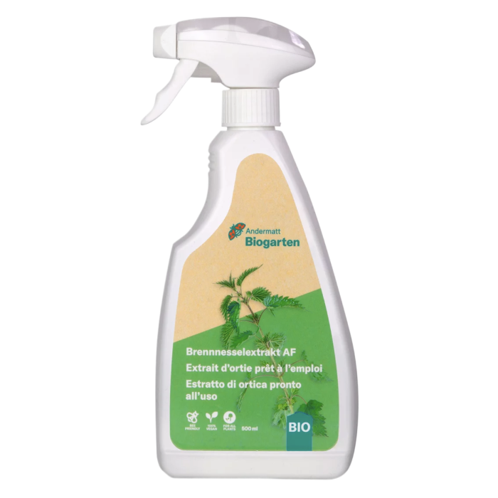 Brennnesselextrakt wird aus frischen Brennnesseln und Kresse hergestellt. Das Konzentrat verdünnt man vor der Anwendung mit Wasser. Der Brennnesselextrakt AF (anwendungsfertig) ist bereits für die Sprühanwendung verdünnt und eignet sich vor allem da, wo nur einzelne, kleinere Pflanzen behandelt werden sollen.