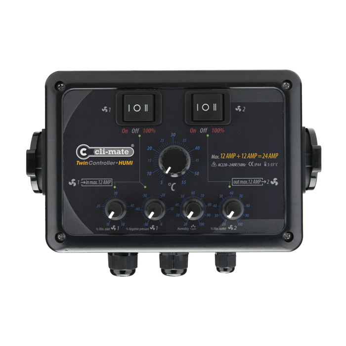 Der Twin-Controller TW.H ist ein Temperatur- und Feuchteregler für Ventilatoren, mit zwei Einstellungen für die Mindestgeschwindigkeit (IN & OUT) und einer für den Unterdruck. Er ermöglicht die Steuerung des Lufteintritts und des Luftaustritts (Absaugung) mit unabhängigen Einstellungen. Er ist mit einem doppelten Sensor für Temperatur und Feuchtigkeit ausgestattet.
