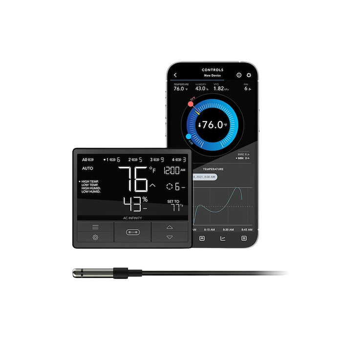 Ein Controller der nächsten Generation, der AC Infinity-Geräte mit einer intelligenten Programmierung ausstattet, um optimale Klimabedingungen zu schaffen. Diese zentrale Steuereinheit kann mit bis zu vier verschiedenen Geräten verbunden werden, von Ventilatoren bis hin zu Grow Lights, und bietet jedem Gerät eine unabhängige Klima- und Zeitprogrammierung. Das hintergrundbeleuchtete Display zeigt die Temperatur in Fahrenheit oder Celsius an und kann ausgeschaltet werden, während die Programme im Hintergrund laufen. Er ist mit einem Standfuß ausgestattet und kann mit den mitgelieferten Halterungen an der Wand befestigt werden. Der Messfühler mit Thermolegierungskopf misst die aktuelle Temperatur und Luftfeuchtigkeit genau. Sie erfasst auch das Dampfdruckdefizit (VPD), das die Umgebungstemperatur, die relative Luftfeuchtigkeit und die Blatttemperatur der Pflanze misst, um die optimale Atmosphäre zu bestimmen. So kannst du die Wachstumsbedingungen genauer überwachen, als wenn du dich nur auf Temperatur und Luftfeuchtigkeit verlassen würdest. Dieses Produkt ist Teil der UIS-Plattform von Anbaugeräten und intelligenten Controllern, die so konzipiert sind, dass sie miteinander integriert werden können, um deine ideale Umgebung zu erreichen.