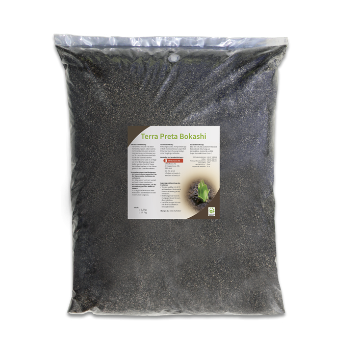 Terra Preta Bokashi ist eine mit EM und Zuckerrohrmelasse fermentierte Mischung aus Weizenkleie, Biokohle und EM Keramik Super Cera-C Pulver. Die Biokohle wird während der Fermentation mit EM besiedelt. Die grosse innere Oberfläche der Biokohle (300–400 m2/g) dient den Bodenbakterien zur Aktivierung des Bodens. Die Biokohle im Terra Preta Bokashi verrottet nicht im Boden, sondern dient dem nachhaltigen Humusaufbau. Humusreiche Böden sind ertragreicher und speichern die Feuchtigkeit besser. Somit ist Terra Preta Bokashi nicht nur ein Nährstofflieferant, sondern auch ein natürlicher Bodenaktivator.