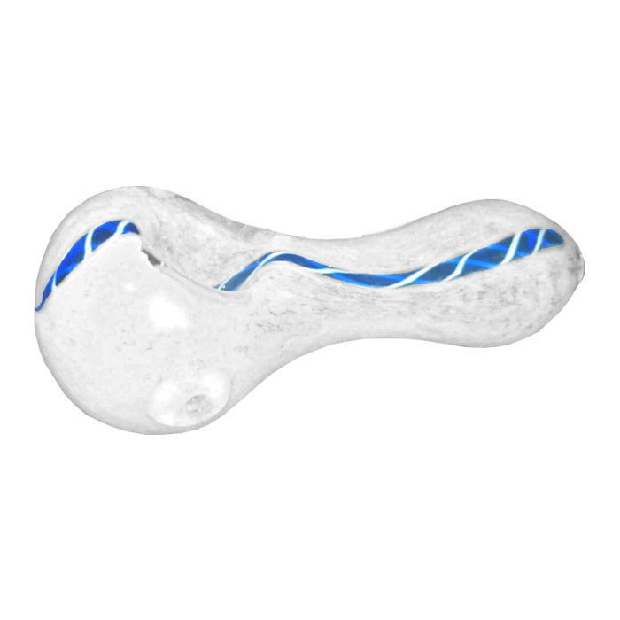 Die Pfeife P010W ist eine futuristisch aussehende und durchsichtige Pfeife, die mit vielen weissen Sprenkeln übersäät ist. In der Mitte auf der Oberseite der Pfeife wurde ein detailliert designtes, blaues Band eingelassen, welches von Mundöffnung bis zum Kopf der Pfeife reicht. Auch hier ist das Mundstück etwas verbreiterter als der Hals.