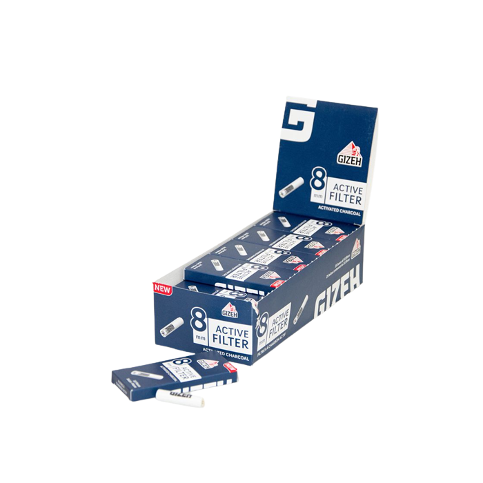 GIZEH Active Filter 8 mm mit Aktivkohle Kokosnuss-Schalen die Aktivkohlefilter im Slim-Format (8 mm Durchmesser) wurden speziell für den King-Size-Genuss entwickelt. Die gereinigte Aktivkohle im Inneren der Filter wird auf Basis von Kokosnuss-Schalen – einem nachwachsenden Rohstoff – produziert. Die Keramikkappen an beiden Enden haben jeweils sieben Löcher und sorgen für einen optimalen Zugwiderstand. GIZEH BLACK® Active Filter sind „Made in Germany“ und können mehrfach verwendet werden. Filterlänge: 35mm