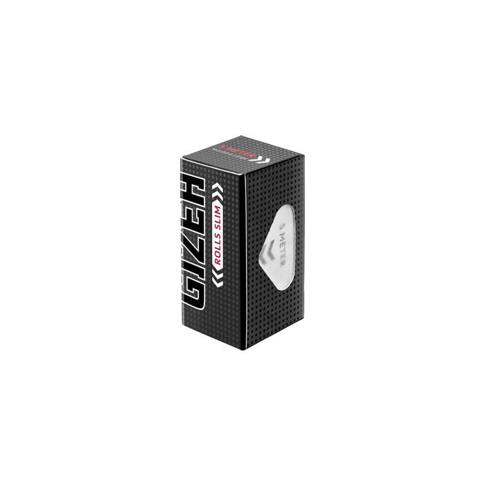 GIZEH BLACK Rolls Slim sind extra feine, fast transparente Blättchen mit einem Flächengewicht von 14.0 g/m² und einer Gummierung aus natürlichem Gummi Arabicum, dem Saft des Akazienbaums. Das extra feine Papier sorgt für puren und unverfälschten Genuss. Durch das Rolls-Format kann die jeweils gewünschte Länge individuell gewählt werden, die Breite entspricht dem King Size Slim-Format. Das Papier brennt sehr langsam ab und geht aus, wenn nicht an der Selbstgedrehten gezogen wird. Eine Rolle bietet 5 Meter Blättchen für individuellen Genuss.