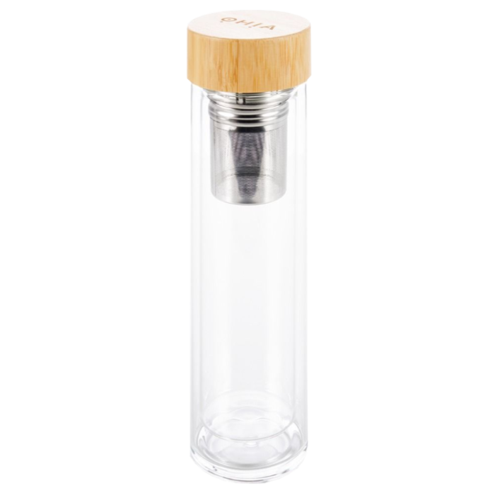 Diese schlichte und doppelwandige Thermosflasche aus Glas von OHIA gehört ab sofort in jede Tasche, auf jeden Bürotisch und neben die Yogamatte. Sie eignet sich wunderbar für heisse sowie kalte Getränke und besitzt ein herausnehmbares Teesieb, mit welchem du wahlweise deine Lieblingstees einfüllen, mit heissem Wasser übergiessen und gleich mitnehmen kannst. Der Deckel besteht aus Bambus und bedeutet somit kein zusätzliches Gewicht. So bist du immer bereit und On the Go für einen guten Start in den Tag.