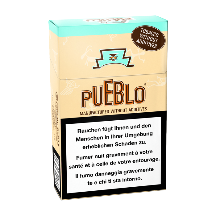 Hergestellt aus amerikanischen Virginia Tabaken - Tabak ohne Zusatzstoffe. Pueblo Box: 10 mg Teer - 1,0 mg Nikotin - 10 mg Kohlenmonoxid.