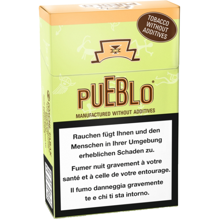 Hergestellt aus amerikanischen Virginia Tabaken - Tabak ohne Zusatzstoffe. Pueblo Box: 8 mg Teer - 0.7 mg Nikotin - 8 mg Kohlenmonoxid.