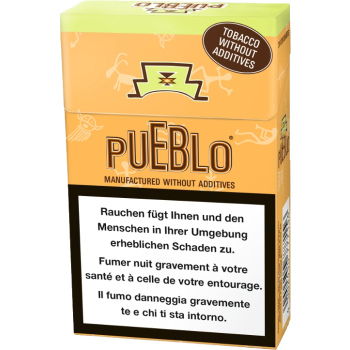 Hergestellt aus amerikanischen Virginia Tabaken - Tabak ohne Zusatzstoffe. Pueblo Box: 4 mg Teer - 0.4 mg Nikotin - 4 mg Kohlenmonoxid.