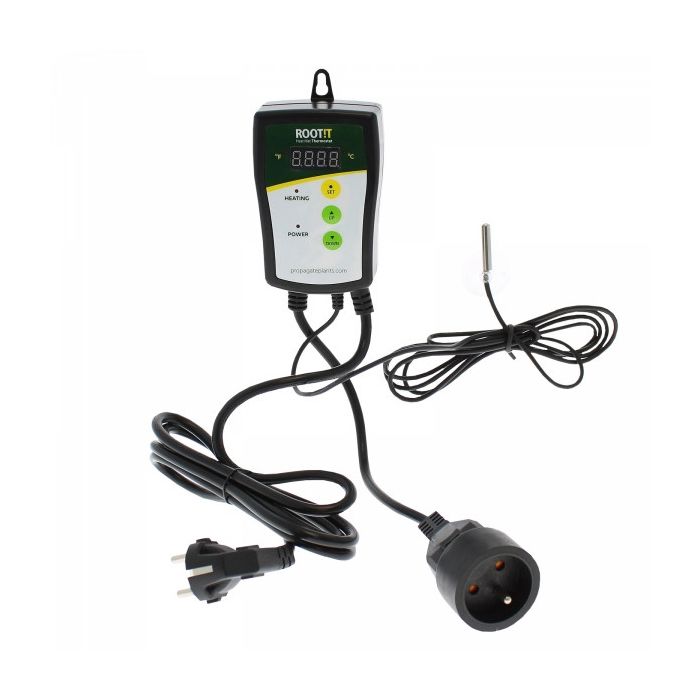 ROOT!T Wärmematten-Thermostat, EU Schuko Der ROOT!T Wärmematten-Thermostat regelt die optimale Bewurzelungstemperatur und sorgt damit bei Deinen Pflanzen für ein schnelleres Wachstum. Er gibt Dir eine bessere Kontrolle, indem er die Temperatur überwacht und die Heizmatte innerhalb eines voreingestellten Temperaturbereichs nach Bedarf ein- und ausschaltet. Eine leicht ablesbare Digitalanzeige stellt sicher, dass die Benutzer die Temperaturen überwachen und bei Bedarf Maßnahmen ergreifen können.