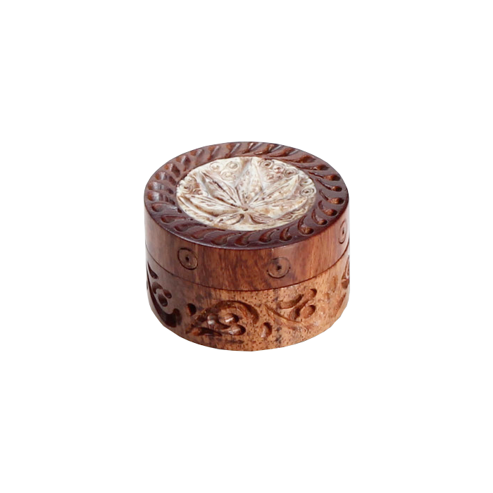 Rosenholz-Mühle Om 2-tlg. geschnitzt mit Intarsie und Stiftzähnen. In die Specksteineinlage ist ein Hanfblatt-Motiv geritzt.