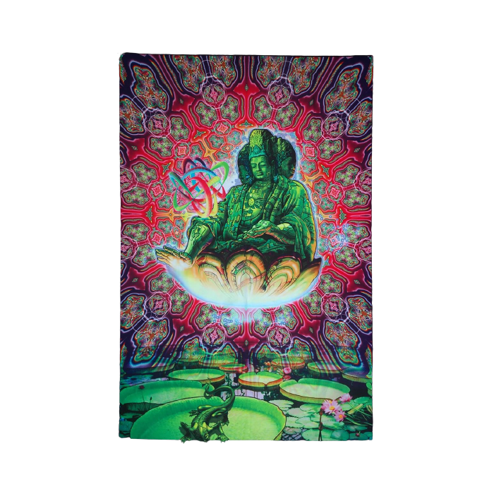 Maitreya Buddha schwebt auf seinem Lotusblumenwagen und strahlt seine Schwingung durch den Äther aus, um seine Umgebung zu durchdringen und seine Botschaft der Liebe zu verbreiten.