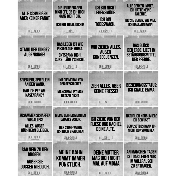 - Große Auswahl: Du erhältst 20 verschiedene Sprüche und Motive (jedes Design ist doppelt vorhanden).